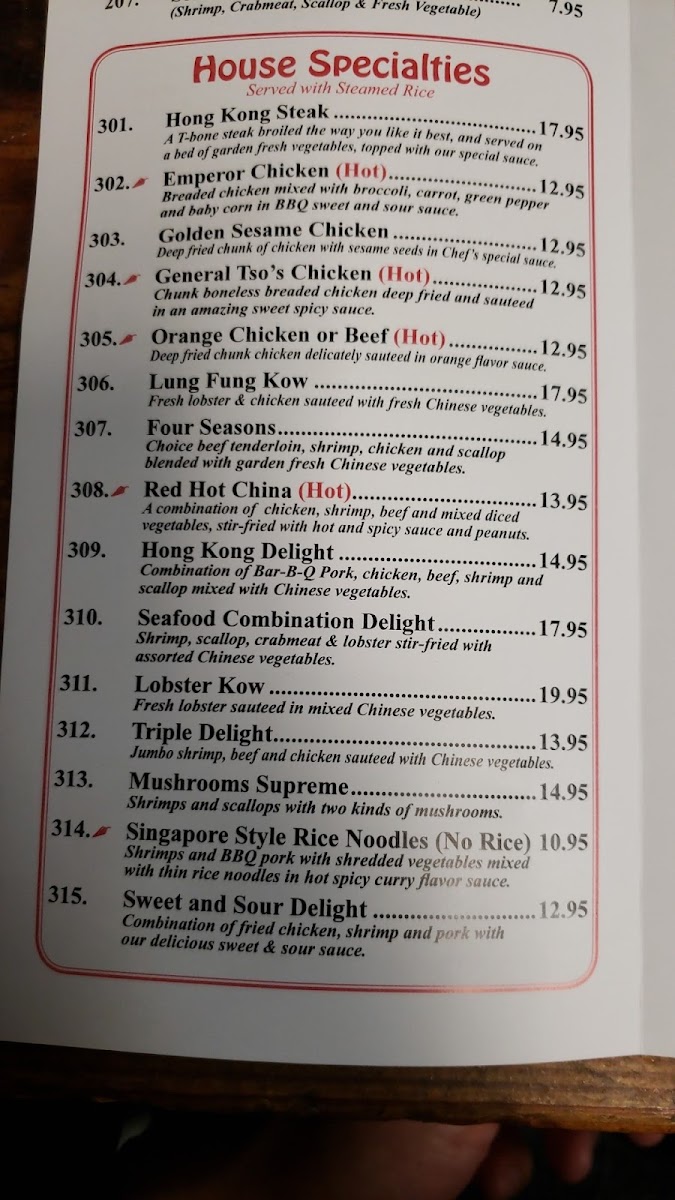 Seafood aficionados will not be disappointed either; the Large Salt & Pepper Shrimp ($24.95), known for its spicy and crisp coating, is frequently praised as a standout dish. Dive into the Seafood Combination Soup, an invigorating blend of shrimp, crabmeat, scallops, and fresh vegetables that warms the soul at $17.95. With each slurp, you'll appreciate the fresh flavors that Hong Kong Lite is celebrated for.